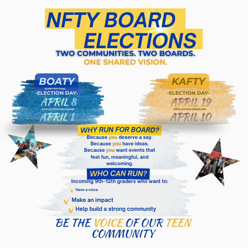 NFTY Board Elections are coming up and this is your chance to step up. Whether you are part of BOATY or KAFTY, two communities sharing one vision: creating events that feel fun, meaningful and welcoming for everyone.