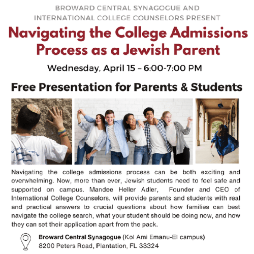 Navigating the college admissions process can be both exciting and overwhelming. Now, more than ever, Jewish students need to feel safe and supported on campus. Mandee Heller Adler, Founder and CEO of International College Counselors, will provide parents and students with real and practical answers to crucial questions about how families can best navigate the college search, what your student should be doing now, and how they can set their application apart from the pack.